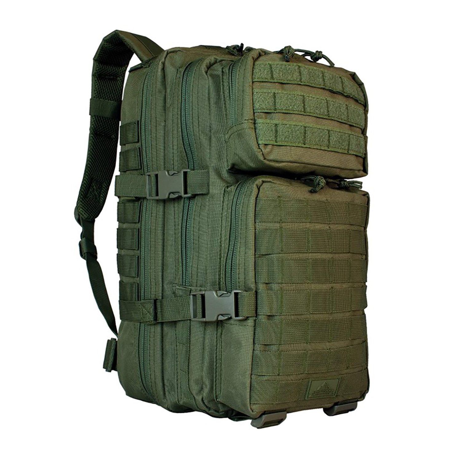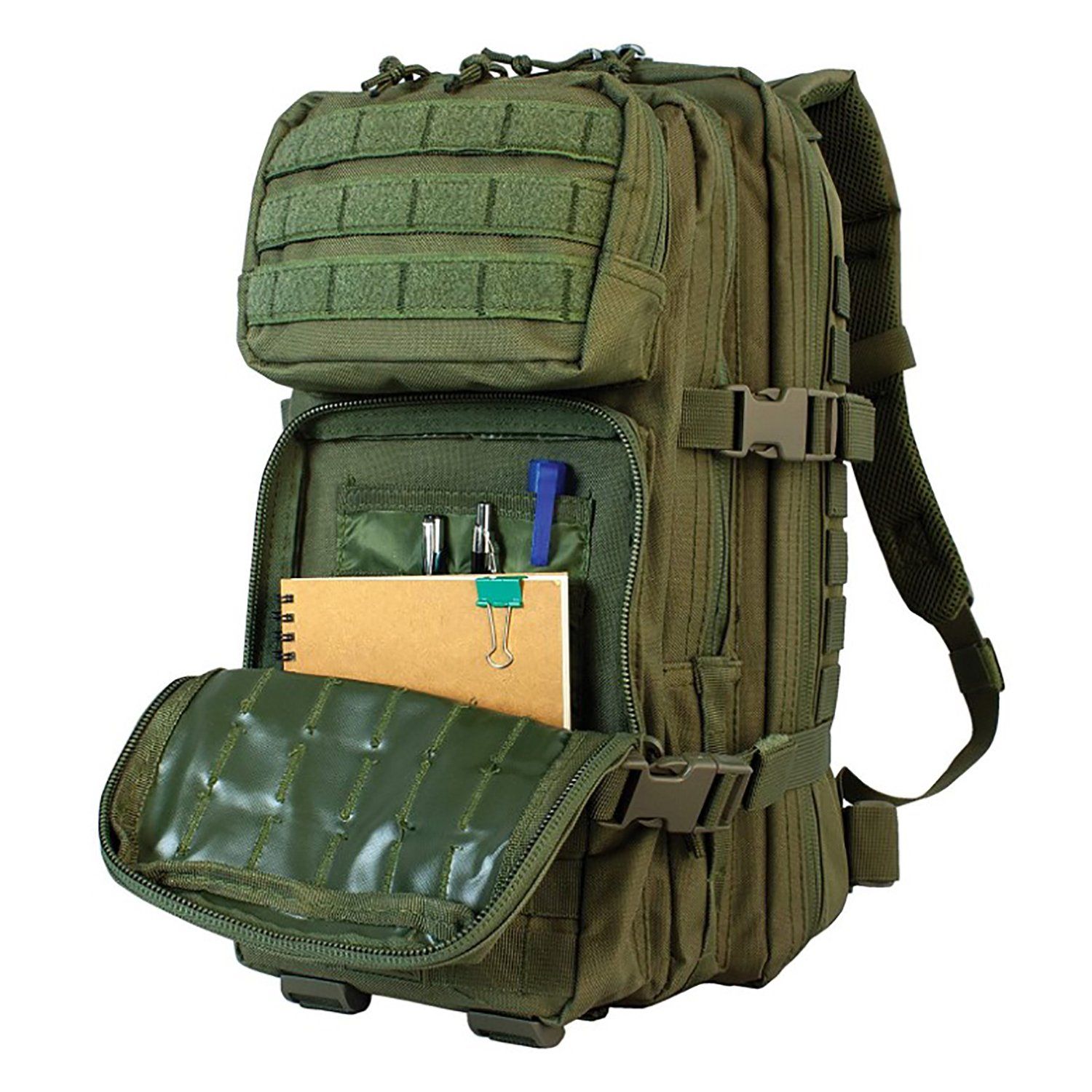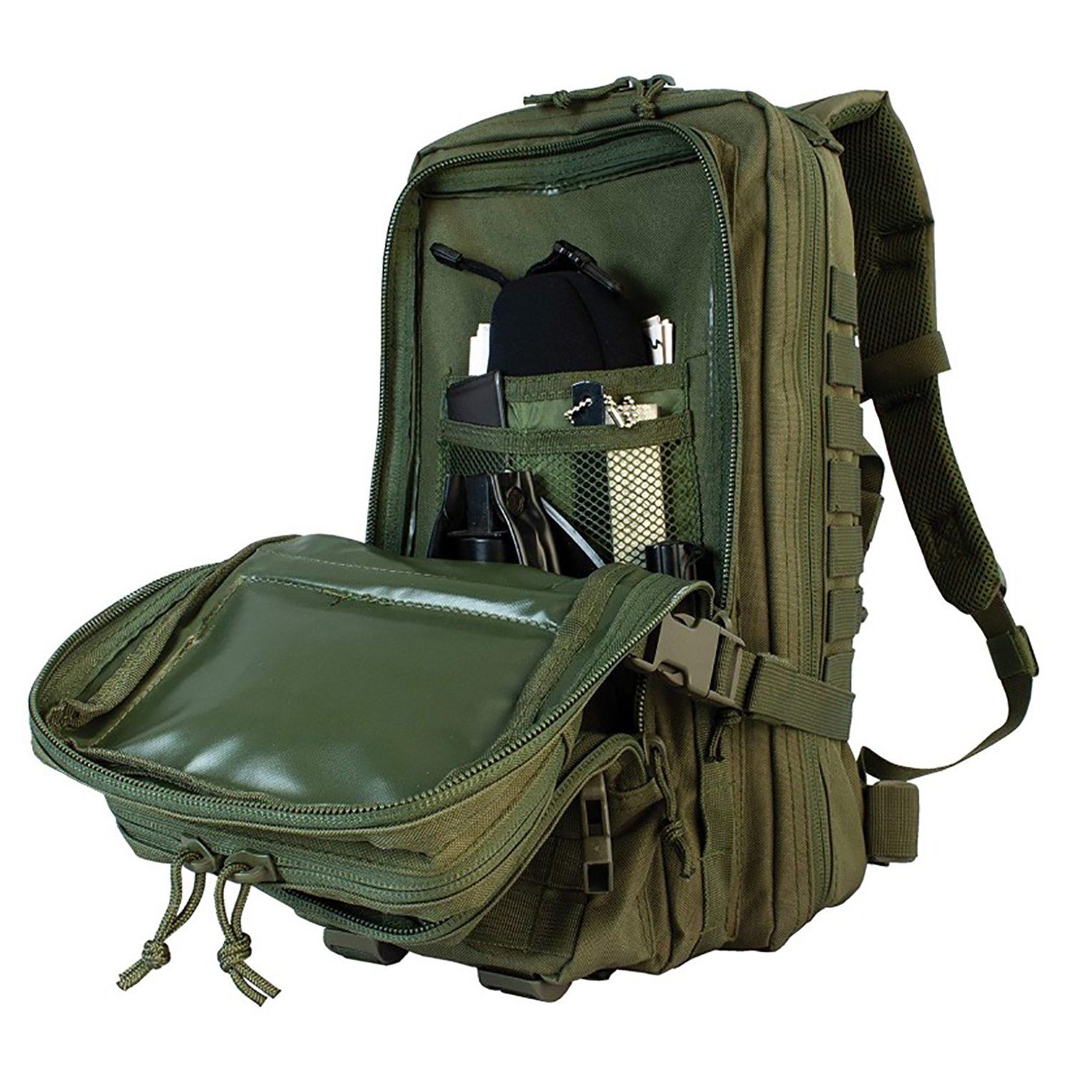 Feature | Four expanding compartments; Main compartment features a clam shell style design; Two external pockets for quick access to essentials Fully adjustable contoured and padded shoulder straps; Adjustable waist and sternum straps; Reinforced carry handle Mesh ventilated padded back panel with touch-fastener-closure external pocket that serves as concealed pocket or accepts hydration bladder up to 2.5 liters Quick-release compression straps on three sides; Touch-fastener keepers for excess strap slack; Clad webbing for expansion and customization. Mesh ventilated padded back panel with Velcro top closure Fully adjustable contoured padded shoulder straps with hard plastic D-rings for attachments Medium 2 liter external organizer pocket for survival essentials Four quick release compression straps for expansion or consolidation The Outdoor Gear - Assault Pack Substantial storage, top-notch comfort, and extreme customizability are just a few reasons that such a great backpack. Four expanding compartments provide up to 28 liters of storage with built-in internal dividers and zippered pockets. Adjustable reinforced padded mesh shoulder straps, an adjustable waist strap, and a sternum strap evenly distribute the weight across your shoulders and waist for all-day comfort. A padded mesh back panel serves as a concealed pocket or provides storage for almost any hydration bladder, up to 2.5. With compression straps on three sides, it is a cinch to tighten down your pack or to reduce the volume if you aren't fully loaded. The main compartment features a U-style zipper that allows the compartment to be opened completely. |